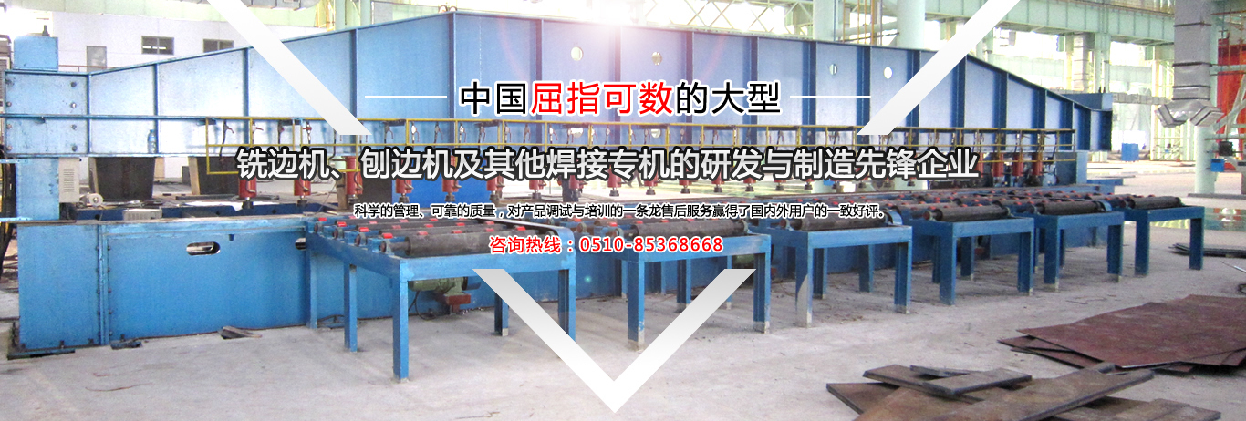 公司是中國金屬銑削切割自動焊接工藝的搖籃,公司是國內制造有壓梁、無壓梁銑邊機、刨邊機及其他焊接專機的專業廠家。取得國家專利局頒發的最新銑、刨邊機產品專利證書。通過了ISO9001.2000國際質量體系認證,并獲得了“全國用戶滿意產品”、“江蘇省質量信得過AAA級品牌企業”的榮譽稱號。銷售網絡遍布全國,部分產品出口東南亞及歐美等國家。公司本著:質量為首,用戶至上,信譽為本...     【詳細】